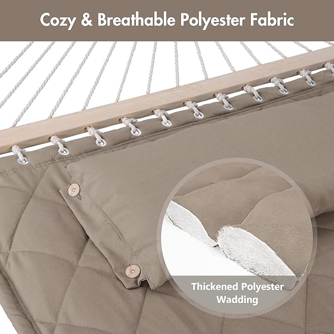 - COMFORTABLE & DURABLE: Double-layered quilted polyester fabric with inner polyester wadding is soft, breathable and long-lasting. Special sewing design increases the beauty and practicality of quilted hammock. Extra polyethylene stuffing hammock pillow offers you superior comfort. It will not fade after long-term use
