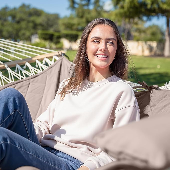- COMFORTABLE & DURABLE: Double-layered quilted polyester fabric with inner polyester wadding is soft, breathable and long-lasting. Special sewing design increases the beauty and practicality of hammock swing. Extra polyethylene stuffing head pillow offers you superior comfort. Hammock pad is detachable for easy cleaning. It will not fade after long-term use