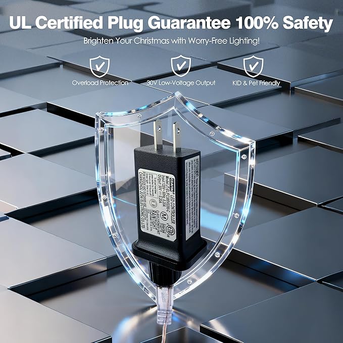 - UL Certified Guarantee 100% Safety: Our LED outdoor Christmas lights were strictly tested and completely fulfill the requirements of UL safety standards with a 29V output voltage (lower than the maximum voltage safe for humans,36V). The LED bulbs keep at a low temperature state so even after long hours of use they are still safe to touch for children and pets. Just plug into an outlet and use it without worry.