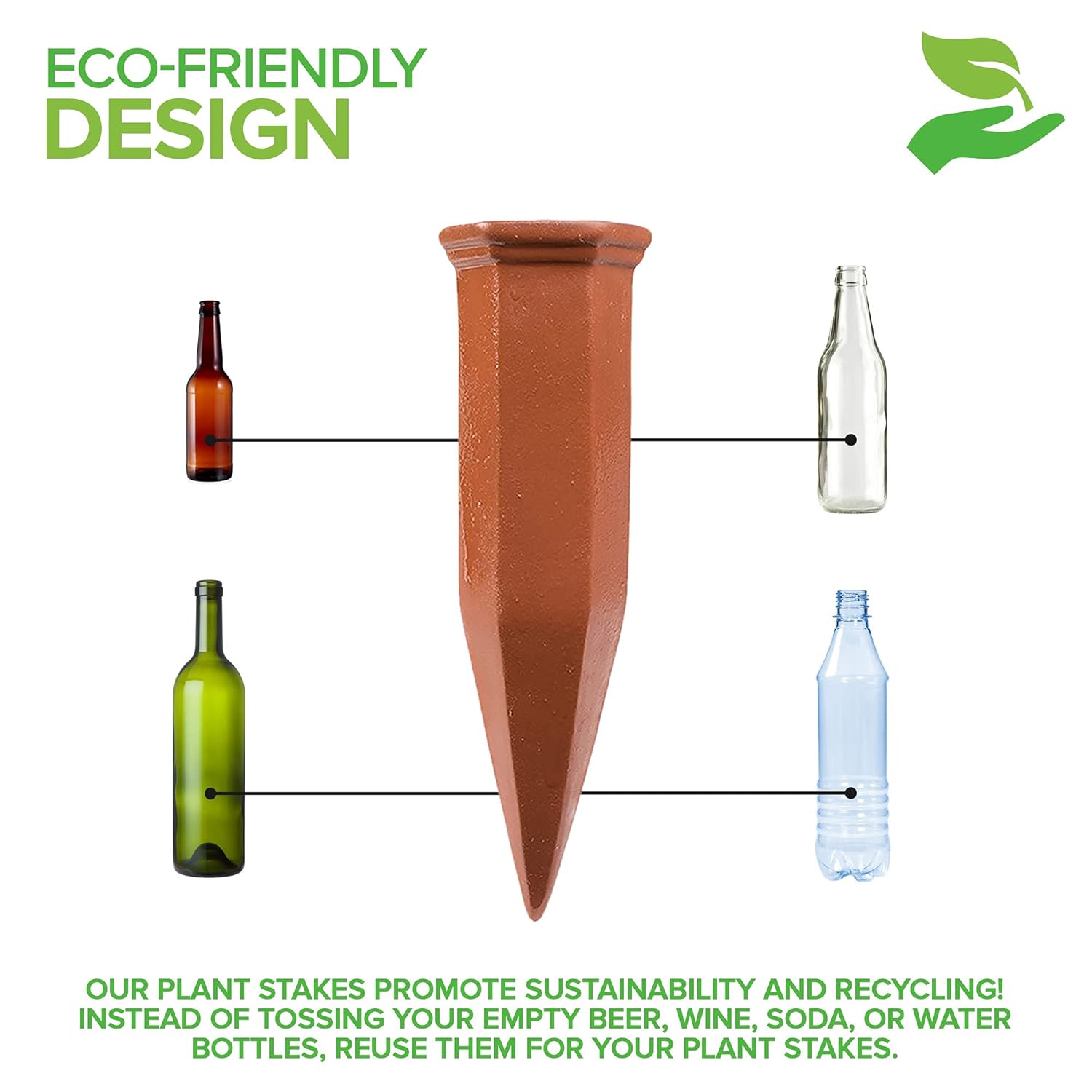 - Eco-Friendly: Instead of tossing your empty water bottles, reuse them for your plant stakes. They can hold any long neck bottle to provide at least 1 liter of water to your plants for upto 7-10 days. As the water begins to run out, just refill.