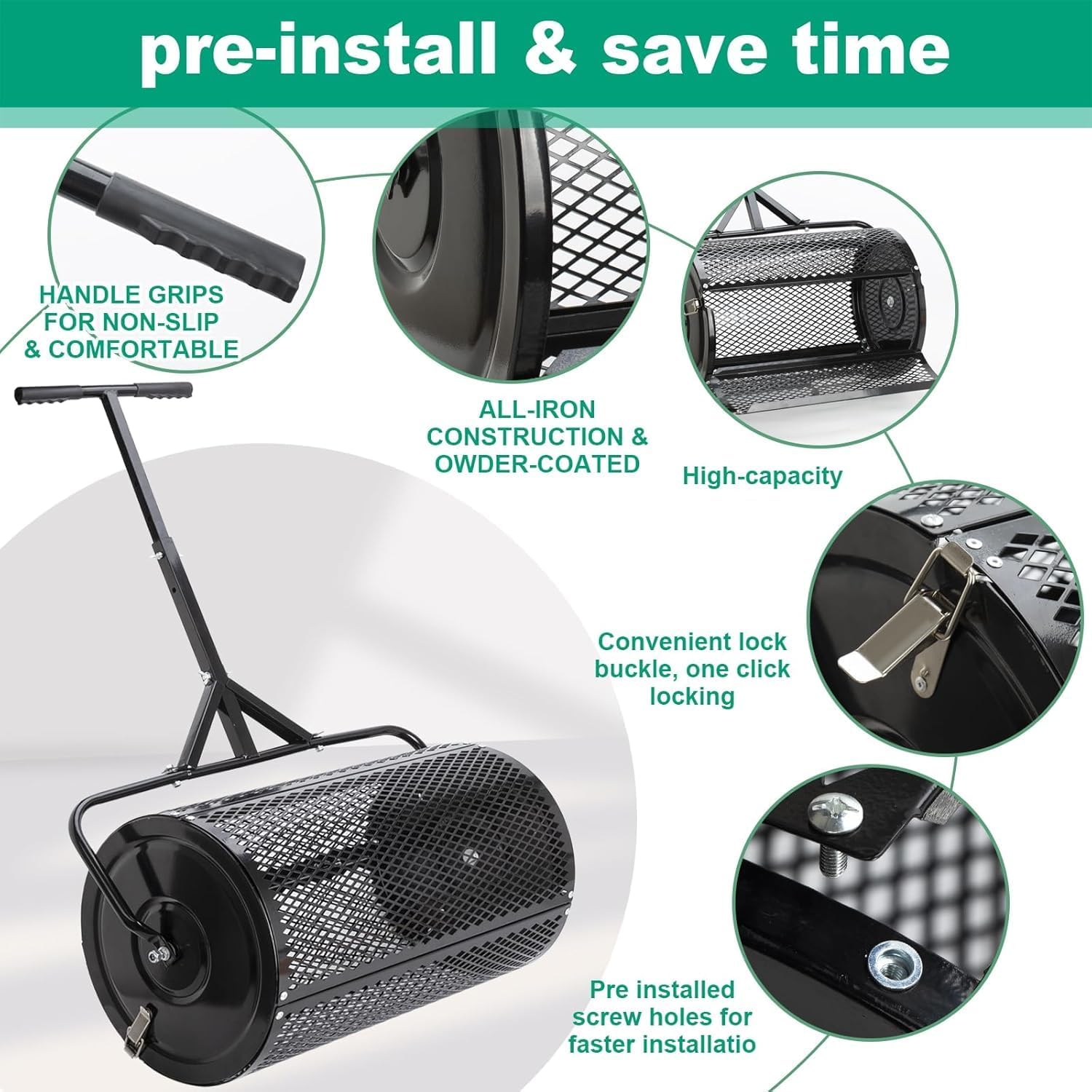 - 27" Peat Moss Spreader: Dense diamond mesh allows peat moss and soil to spread evenly and consistently across your lawn or garden; rollers evenly distribute any fertilizer material for a more lush lawn or garden.