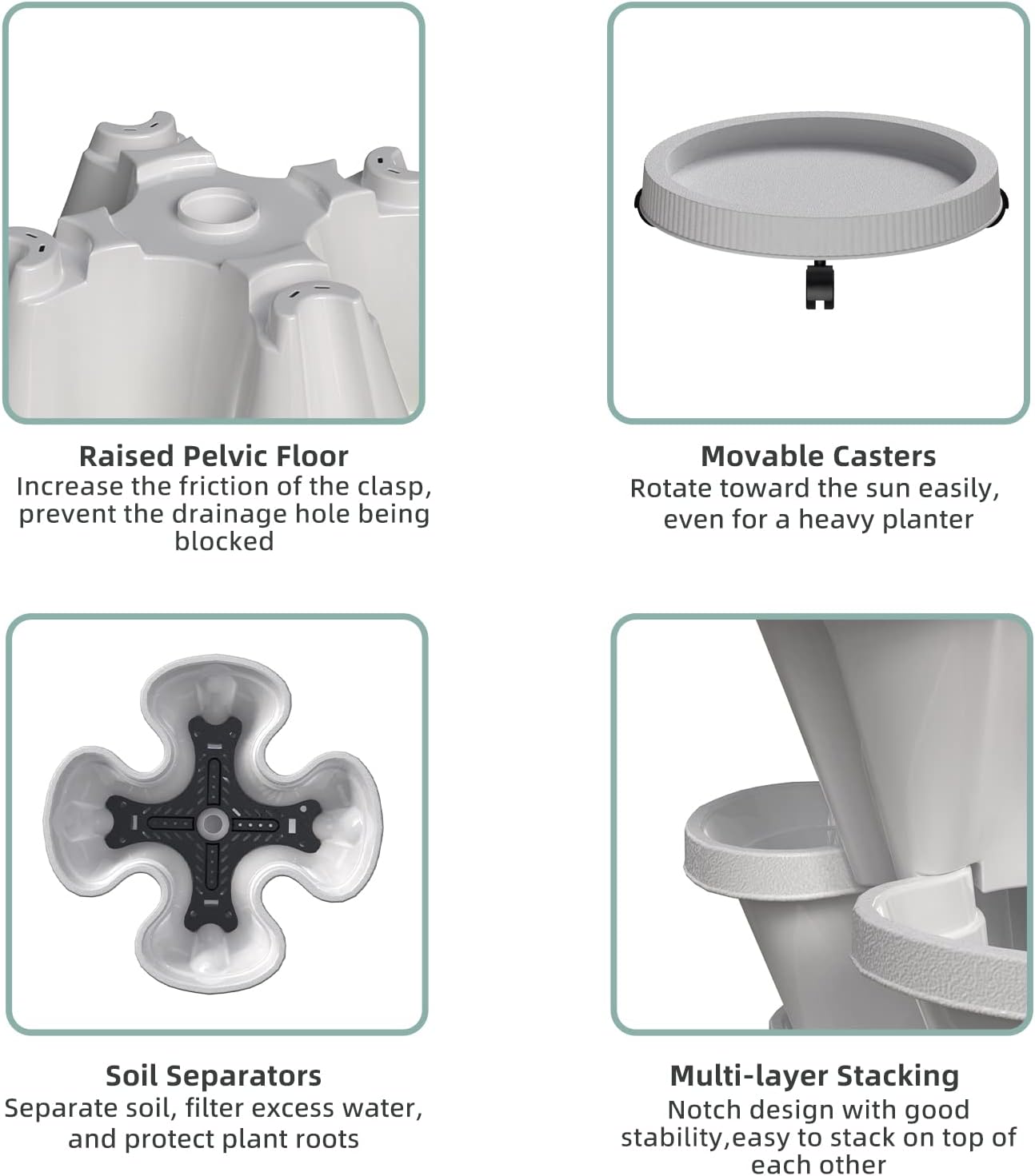 Strawberry Vertical Planters, 3 Tiered Stacking Tower Garden, Stackable Herb Vegetable Planters with Movable Casters and Bottom Saucer Indoor and Outdoor - White