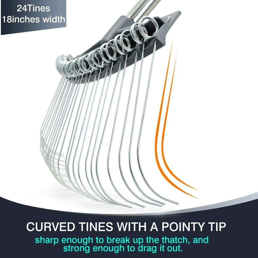 - EASY TO USE & CLEAN IT OFF -- the angled, spring-loaded tines are sharp enough to break up the thatch, and strong enough to drag it out, requiring no down pressure and allow you to rake standing up. When debris collect on the tines, all you need to do is to flip it over and rub it on the lawn, the dead grass come out easily.