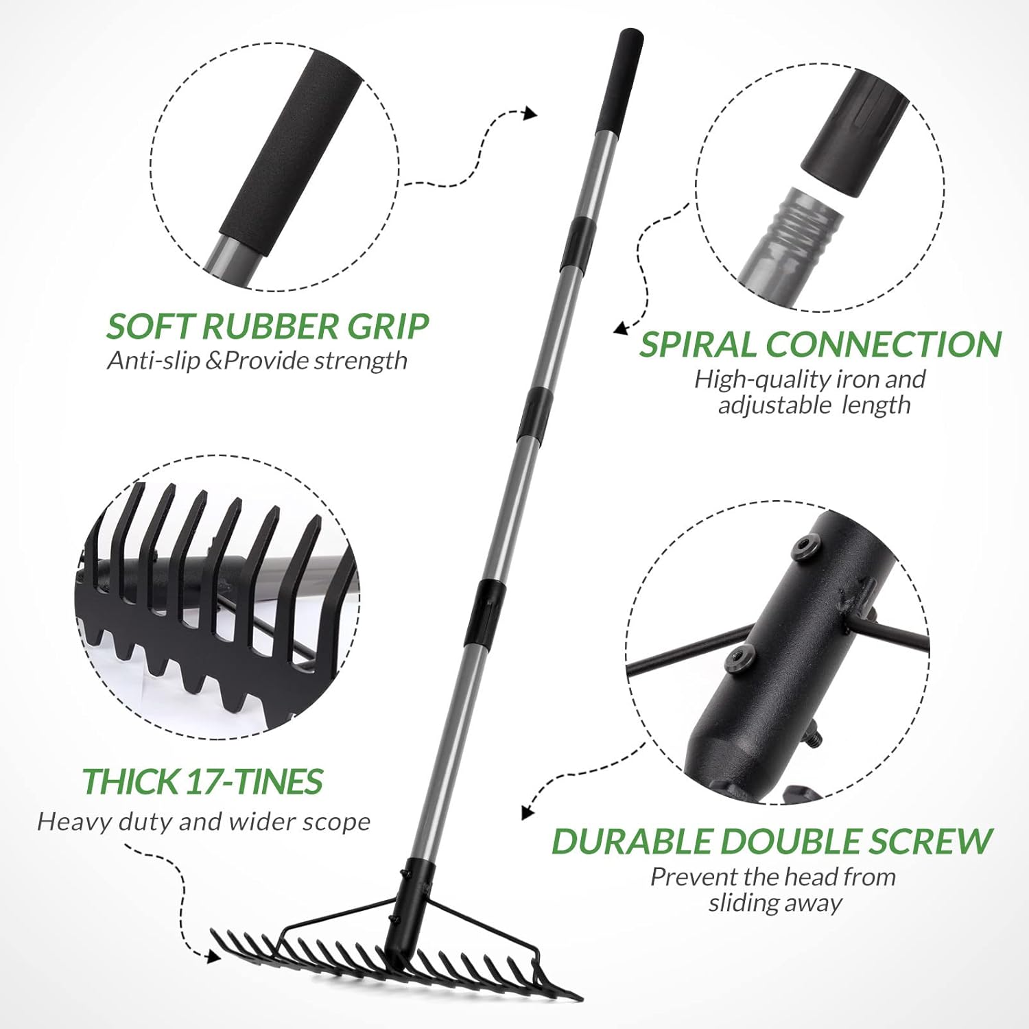 - 17 Tines Head Rake: 17-Tines design makes the garden bow rake pierce into different kinds of soil easily, serving to loosen soil and other garden work efficiently. 2.5” Long Rake tines with 17” wide rake head is ideal for more accurate leveling, wider ground coverage and deeper soil depth without damaging plant feeder roots. The head has 3mm thickness, so you will not experience head tooth break or fracture. Very solid after tightening screws without falling apart or falling off while raking.