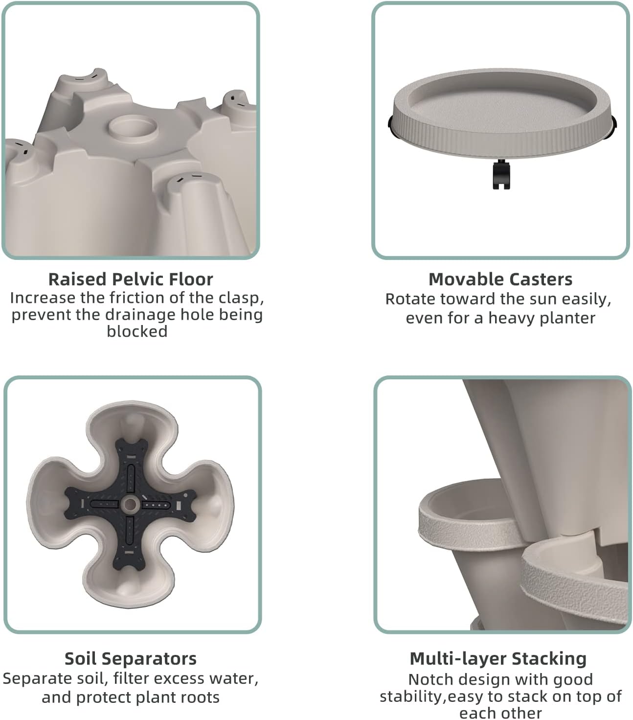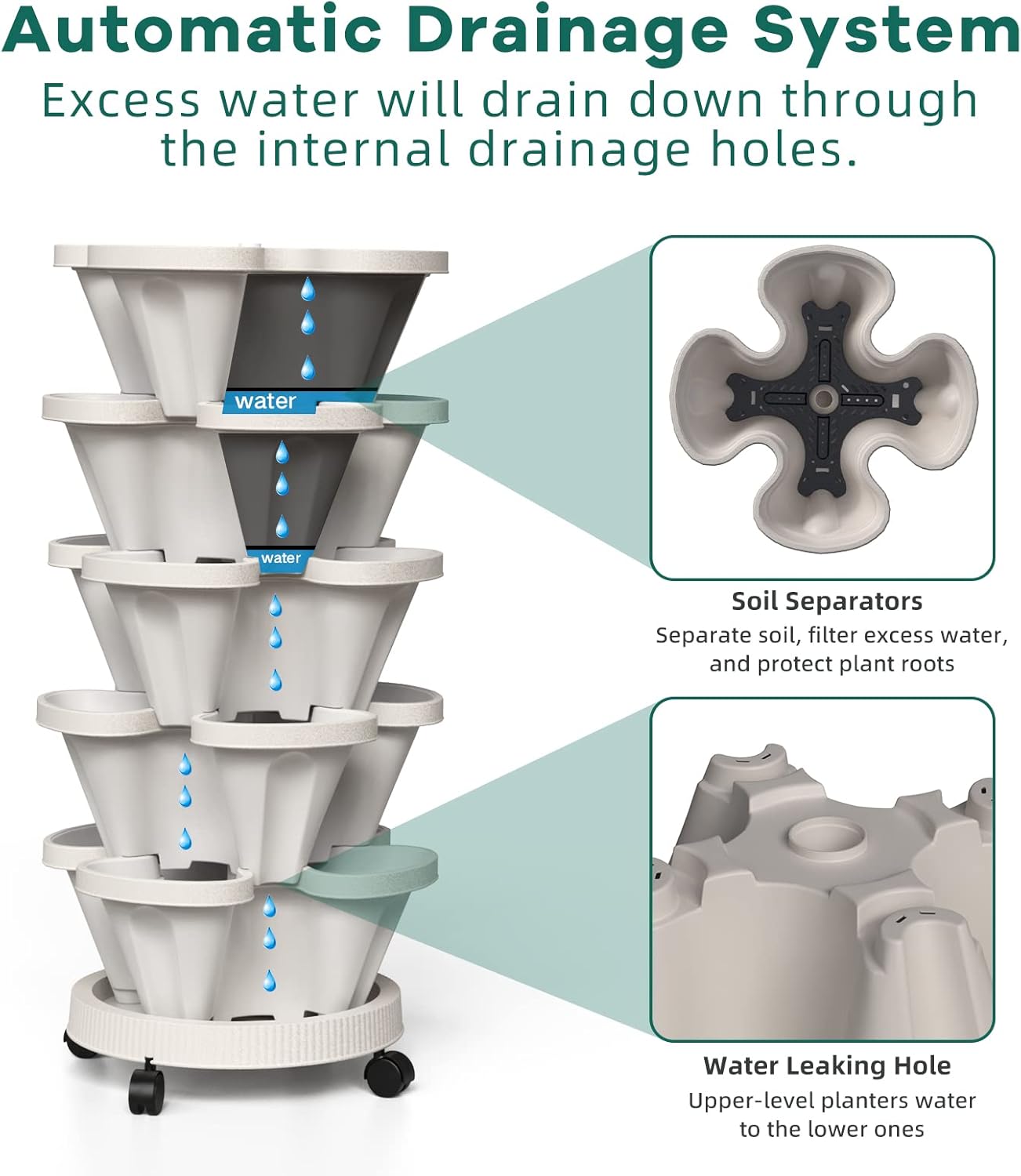 - 5 Tier Vertical Planter - 5 tier stacking planter, made of BPA-free material, can hold up to 20 different plants, such as strawberries, spinach, leaf lettuce, arugula, and mustard greens, and a few smaller herbs and flowers. Plus, it's the perfect vessel for strawberries as the berries cascade over the container lip.