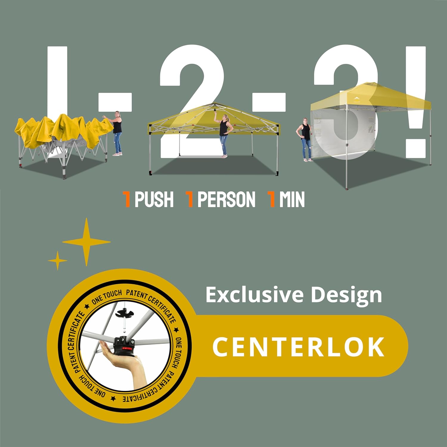 - ONE BUTTON EASY SET UP - Our 10x10 pop up canopy tent features patented one push center lock tech. With just a single push, the central hub locks the poles in place. Designed for the next generation, this outdoor canopy for patio can be set up by two people in seconds without any tools. Three adjustable height settings with soft, pinch-free buttons ensure convenience and safety, making it perfect for camping, beach outings, craft fairs, tailgating, farmer markets, outdoor BBQs, and more