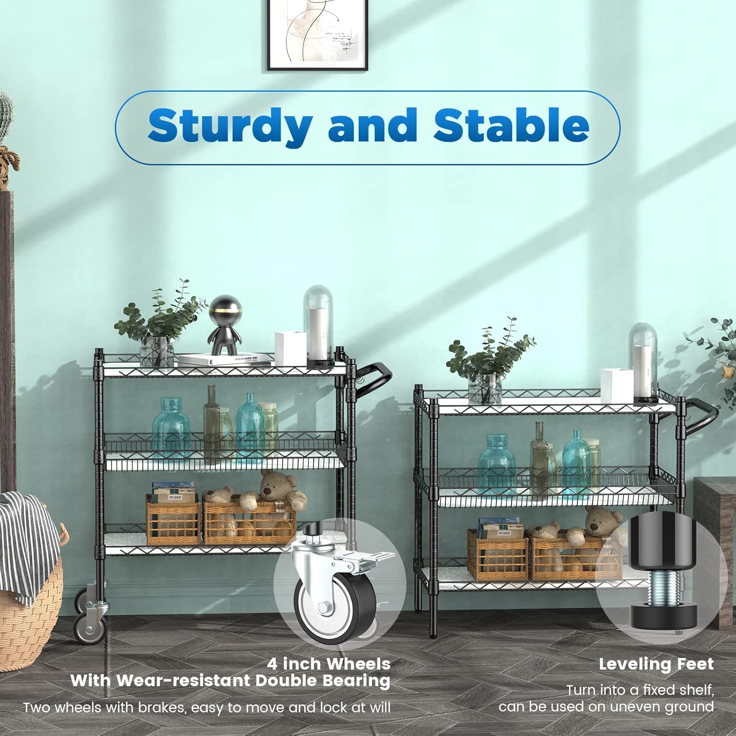 - 【Multifunctional Rolling Storage Cart】: Non-noise 4 wheels, with 2 locking brakes. * Use leveling feet, more stable and firm on uneven ground. * Use brake wheels, move the utility cart freely and can be locked. Comes with a removable handle bar, easy to push to any place. Remove the handle and use the leveling feet, this rolling utility cart will be a wire shelving unit.