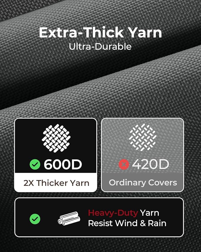 - WATERPROOF: Heavy duty 100% 600D Oxford water-resistant top fabric with added UV-stabilized coating and waterproof undercoating is made to protect your patio furniture cover from natural damage and outdoor elements like sun, dirt, rain, snow.