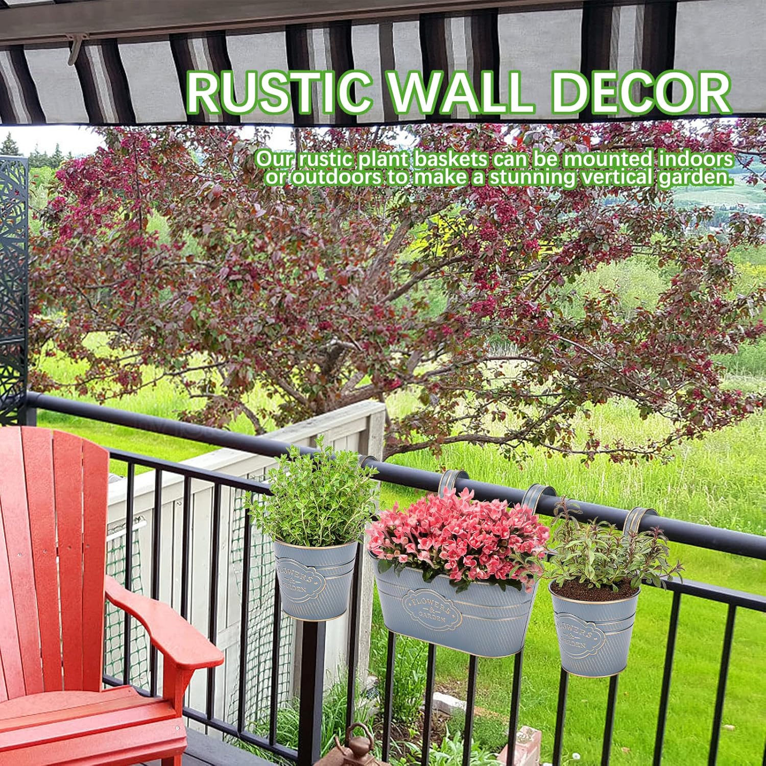PerGar Vintage Metal Iron Wall Hanging Flower Pots, Rustic Planter Bucket Herb Flower Plant Holder with Detachable Hooks & Drainage Hole for Railing Fence Balcony Deck Garden Home Decoration, Set of 3