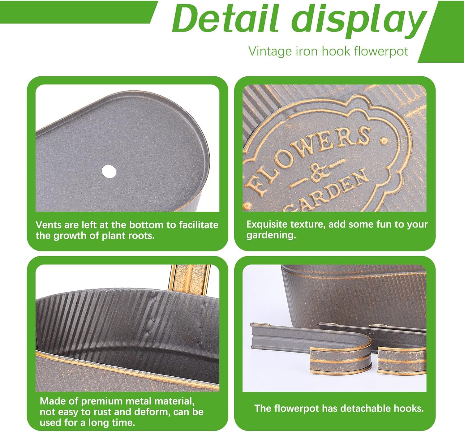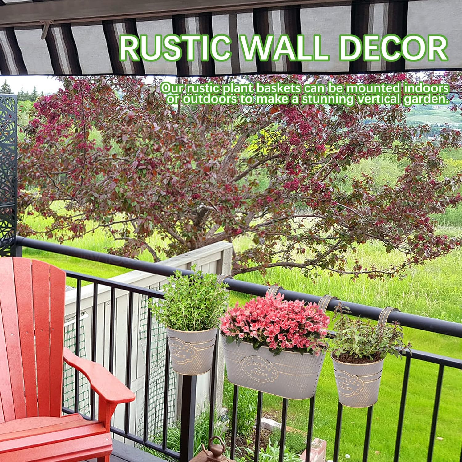 PerGar Vintage Metal Iron Wall Hanging Flower Pots, Rustic Planter Bucket Herb Flower Plant Holder with Detachable Hooks & Drainage Hole for Railing Fence Balcony Deck Garden Home Decoration, Set of 3