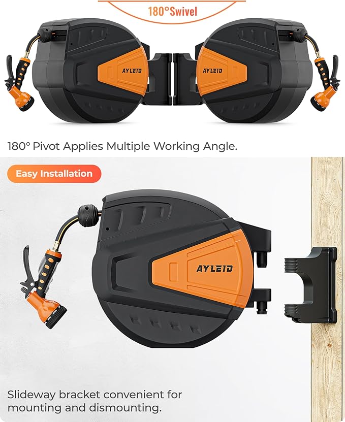 Ayleid Retractable Garden Hose Reel,1/2 in x 130 ft Wall Mounted Hose Reel, with 9- Function Sprayer Nozzle, Any Length Lock/Slow Return System/Wall Mounted/180°Swivel Bracket (Black)