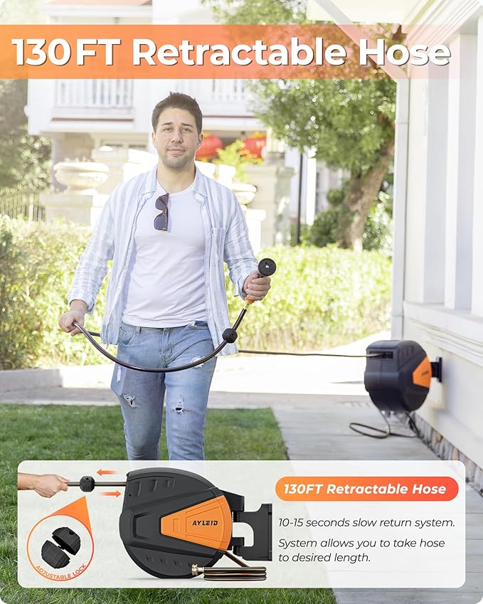 - Effort-Saving Design:1/2 in × 130 ft retractable hose reel with lightweight housing and internal spring reduces pulling resistance, making extension and retraction smoother for daily watering.