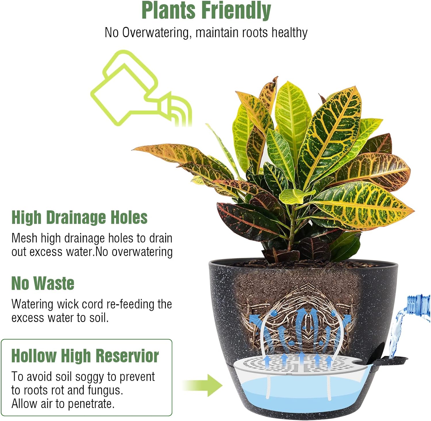 - Self-Watering System: Removable watering feeder allows you to water from the bottom or top without root rot.