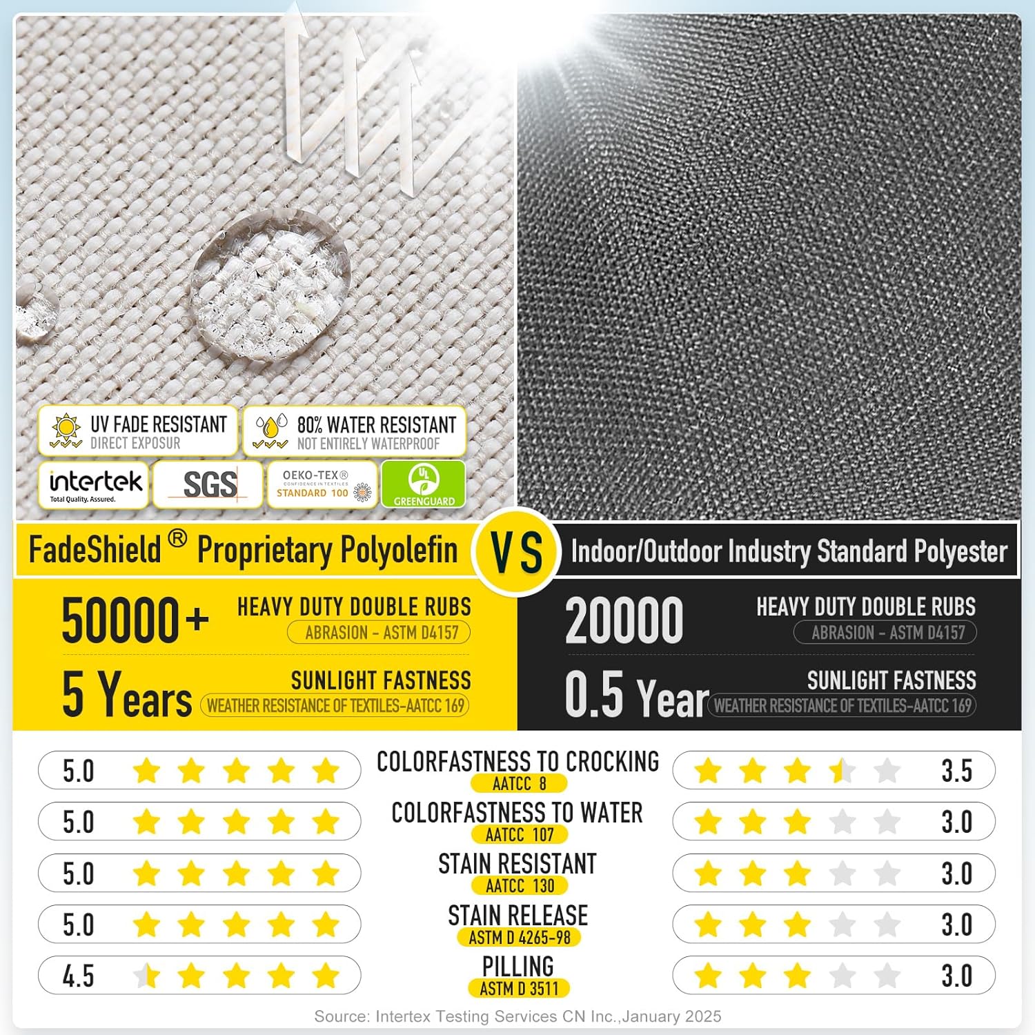 - 【FadeShield - UV Fade Resistant】FadeShield Proprietary Polyolefin are dependable indoor/outdoor performance fabrics, they are infused with antimiсrоbial silver Ion technology and can withstand 5 years of UV fade resistance, solution-dyed to make sure that each color is deeply ingrained in every fiber for continued vibrancy, even after heavy use. We recommend bringing it indoors when it rains or when not in use to preserve its lifespan and keep it looking beautiful.
