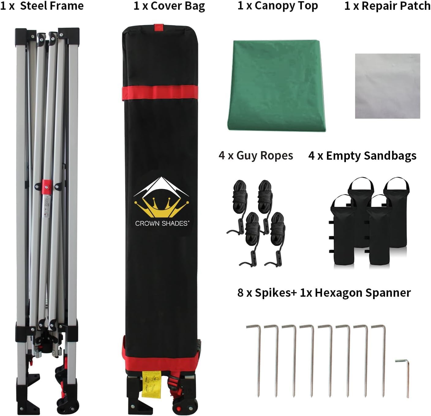 - STO’ N GO SYSTEM - Our lift-free system makes collapsing, storing, and transporting the 10x10 tent a breeze. The 10x10 popup canopy can be stored with the fabric attached, with a specialized pocket for 4 sandbags, 8 stakes, and 4 guy ropes. Integrated wheels in the feet allow easy movement even when the instant shelter tent is set up, by simply lifting the side without wheels. This feature is especially useful for quick setup and takedown at locations like the patio or sports events