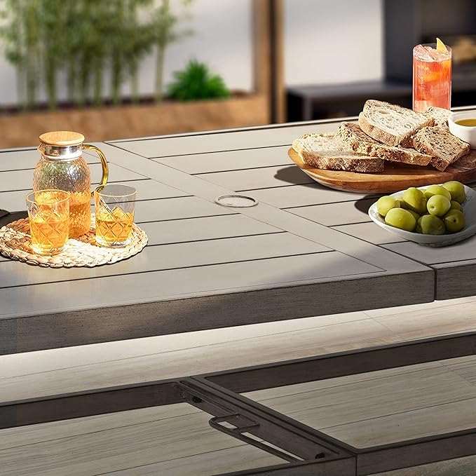 - 【Two-piece Tabletop Design】Adopt mechanical fixed locking structure design, two pieces of tabletop through the latch connection, making the overall structure more stable. Seats up to 8 people.