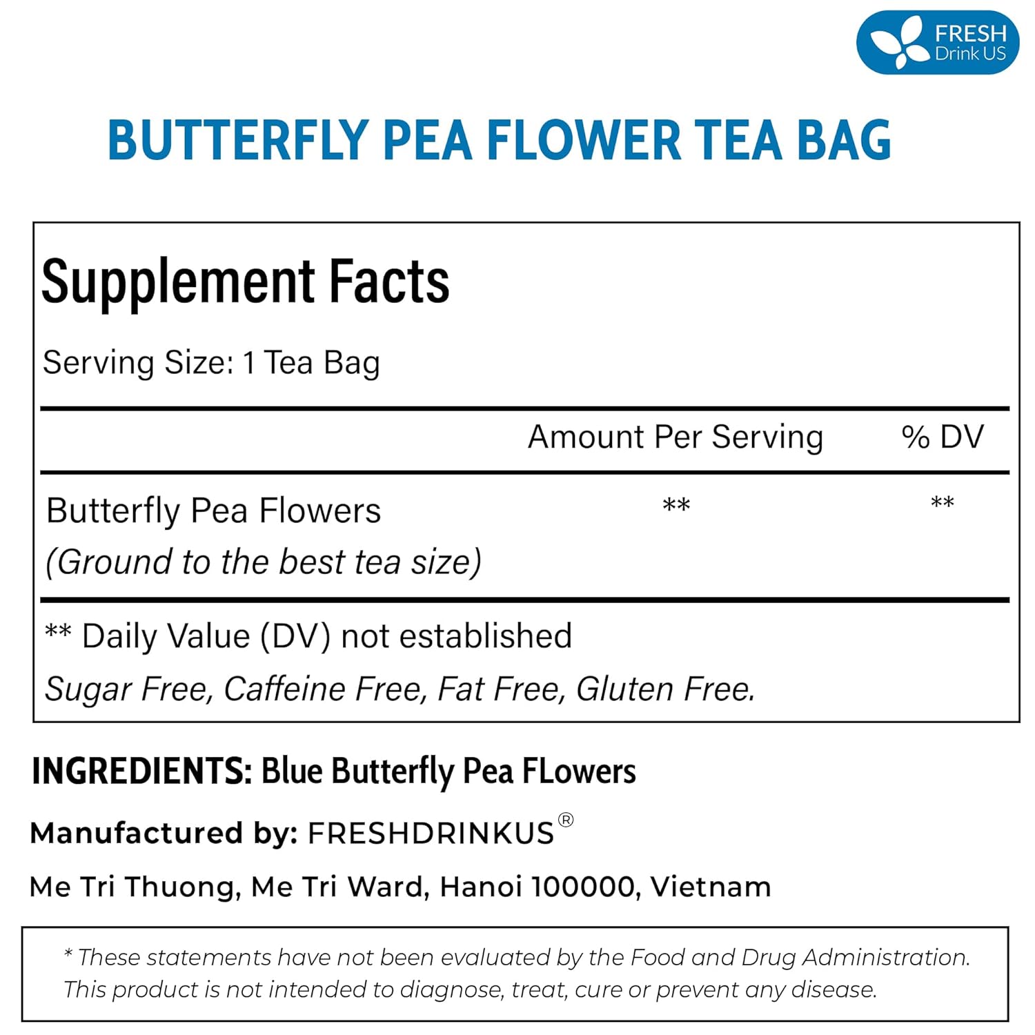 FreshDrinkUS, 100 Premium Butterfly Pea Flower Tea Bags – 100% Pure & Natural | Caffeine-Free Herbal Blue Tea | No Additives, Non-GMO, Made With Natural Material Tea Bag, No Sugar, No Caffeine, No Gluten, Vegan