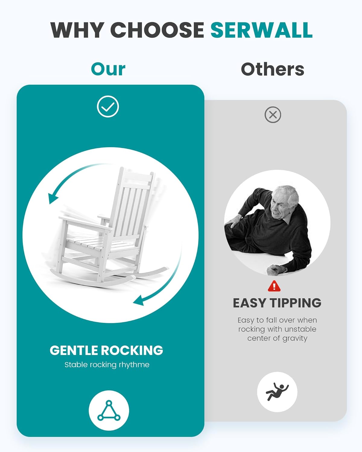 - Details Make It Successful: This porch rocker features an ergonomic curved backrest—unlike traditional straight-back designs—providing superior reclining comfort. With wide armrests and a contoured seat, the SERWALL rocking chair alleviates fatigue. (Tip: Pair it with our cushion [ASIN:B0D7Q1V8ZC] for added comfort.)