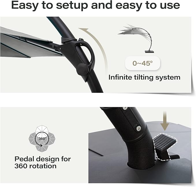 - 【360° ROTATION & INFINITE TILTING】The 12 feet outdoor patio umbrella can be rotated 360° horizontally by simply stepping on the foot pedal and twisting the pole.In addition, the smooth infinite tilting system can change the angle of the canopy and protect the area throughout the day.