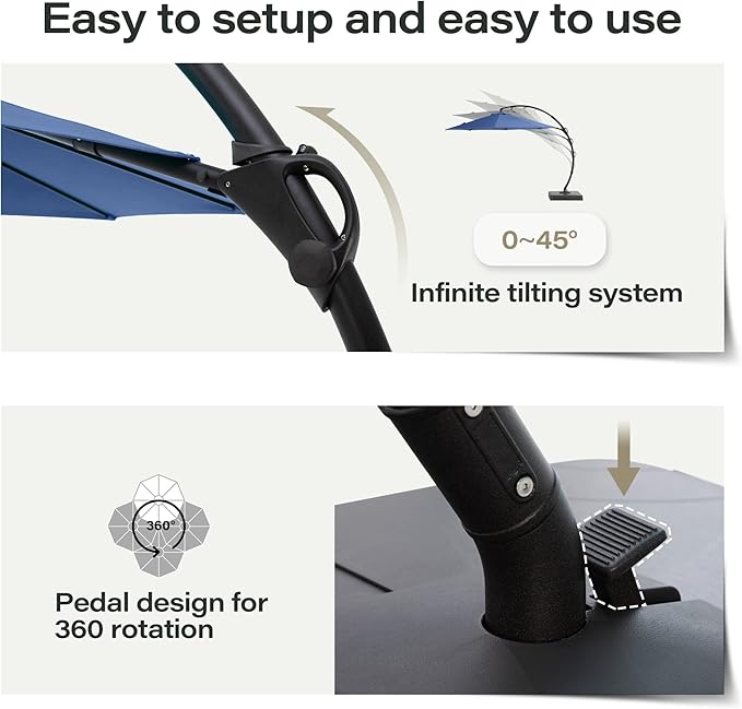 - 【360° ROTATION & INFINITE TILTING 】The 11 feet outdoor patio umbrella can be rotated 360° horizontally by simply stepping on the foot pedal and twisting the pole.In addition, the smooth infinite tilting system can change the angle of the canopy and protect the area throughout the day.