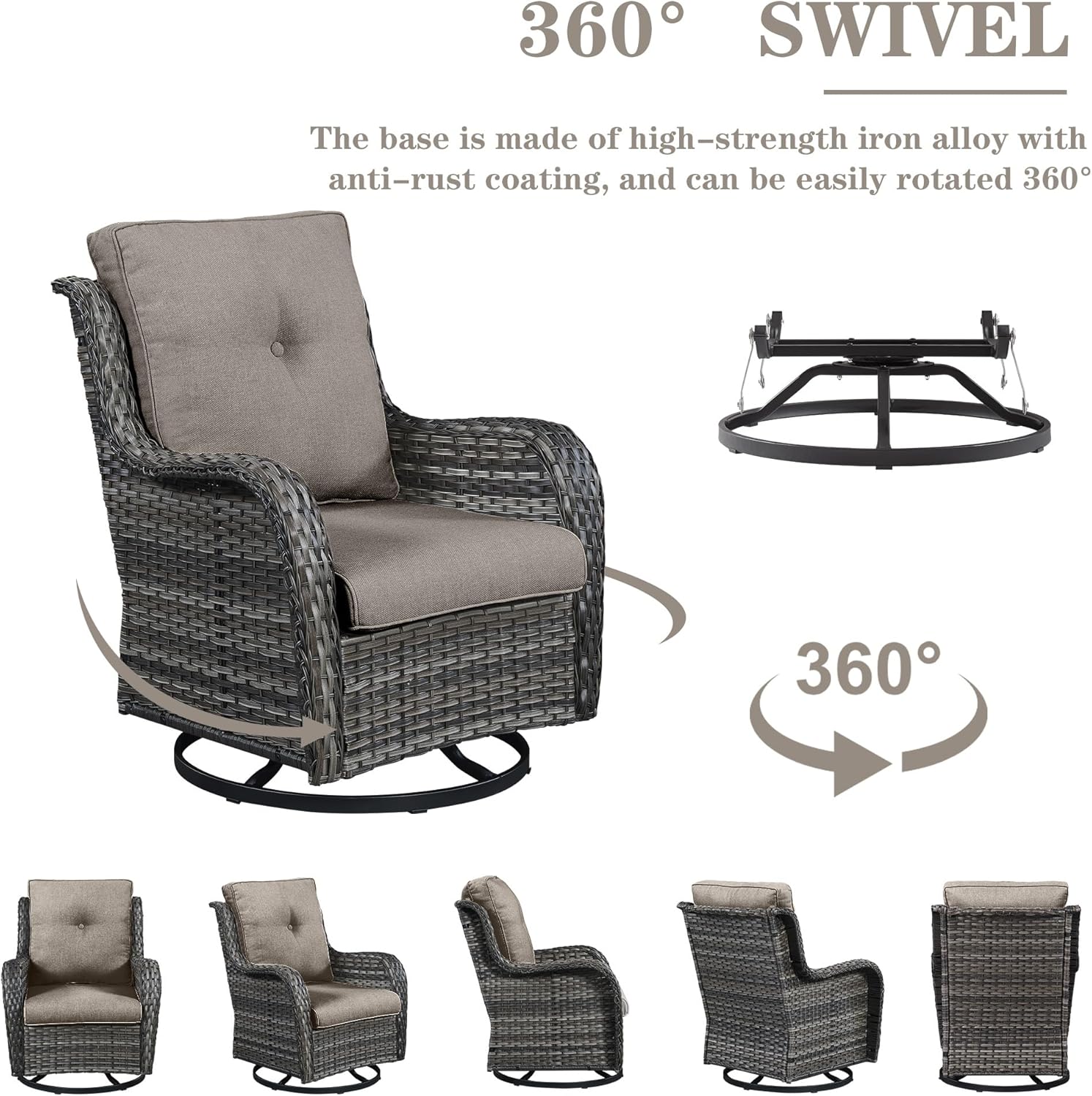 - Patio Furniture Set Introduction: The 6-piece patio furniture set includes 2 swivel glider chairs, 2 ottomans, 1 sofa and 1 glass top coffee table, ottoman can not only be used to relax your legs, but also can be used as a small table or small stool. The swivel chairs can hold up to 350 pounds.