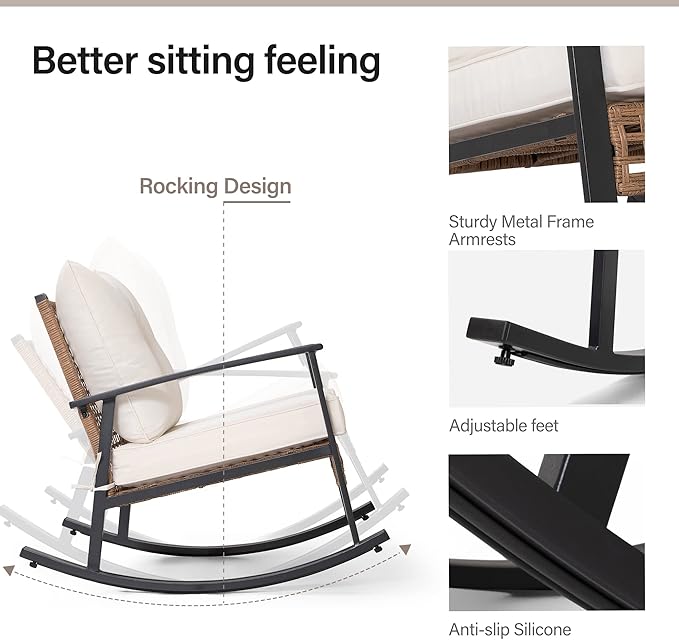 - [Durable Metal & Rattan Frame] Compared with other ordinary rattan, the frame of this patio bistro set is made of sturdy metal & rattan material. The widened rattan has a hollow design, simple & fashionable. & the powder-coated metal rocking chairs & tables are built to be rust-resistant. This patio wicker rocking chair set withstands rain, sun exposure, & wind effortlessly.