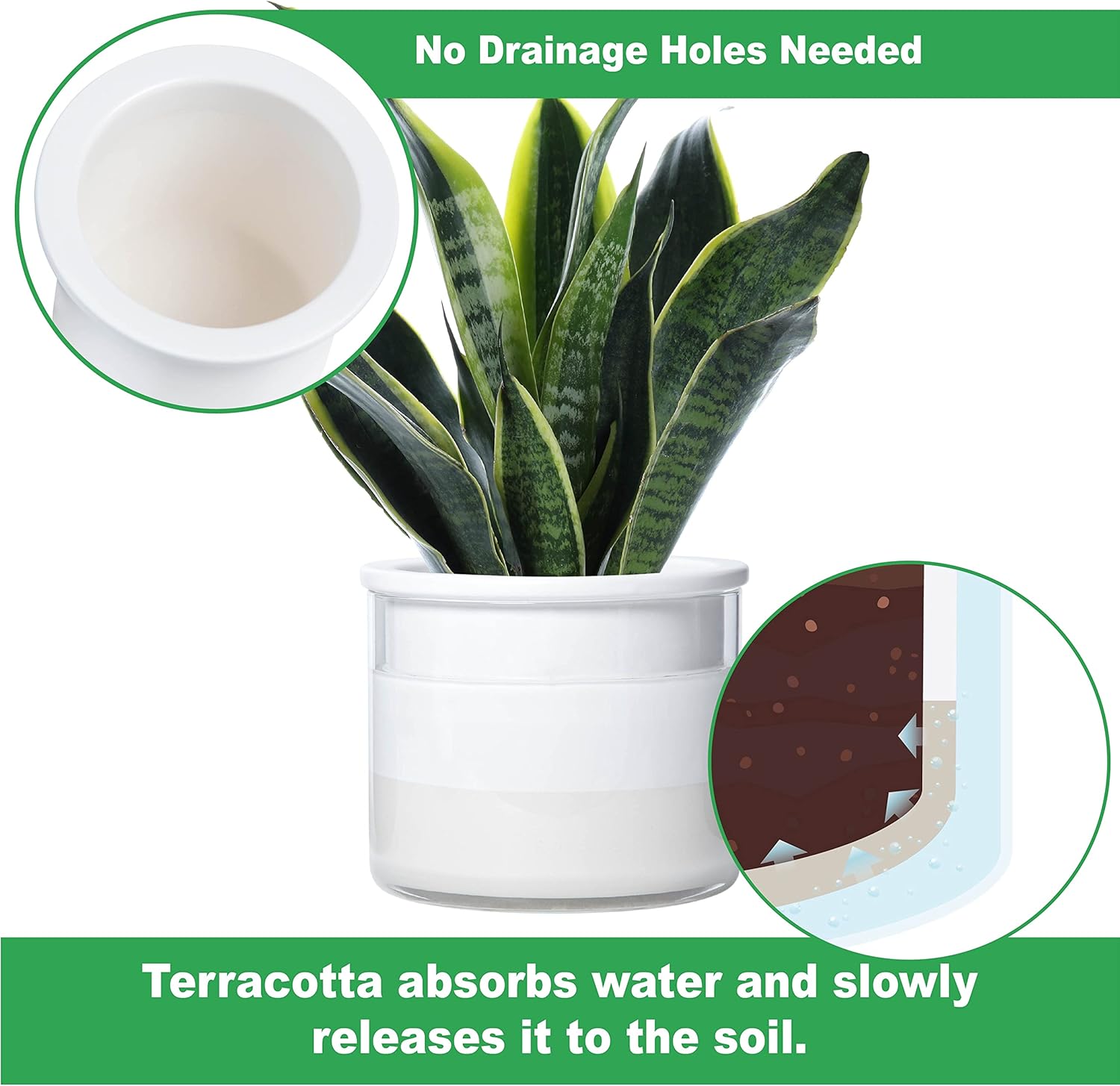 - Self-watering System: The bottom section of the white terracotta pot is unglazed, just fill the glass container with water to ensure plants will absorb only what they need through the terracotta pot walls.