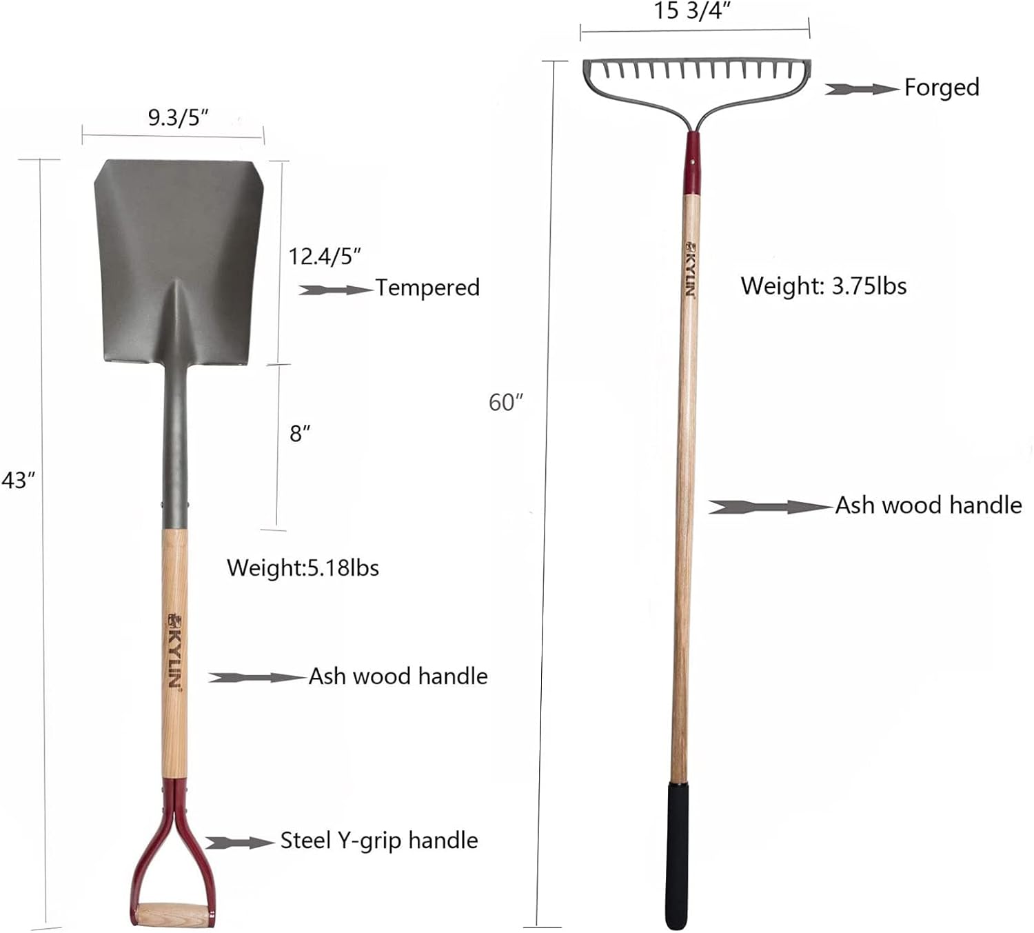 KYLIN Landscaping Shovel Rake Tools Set Heavy Duty Yard Digging Shovels Garden Hoe Long Ash Handle Forged Scraper Bush Hook for Professional-Grade 8 Pieces Lawn Tools