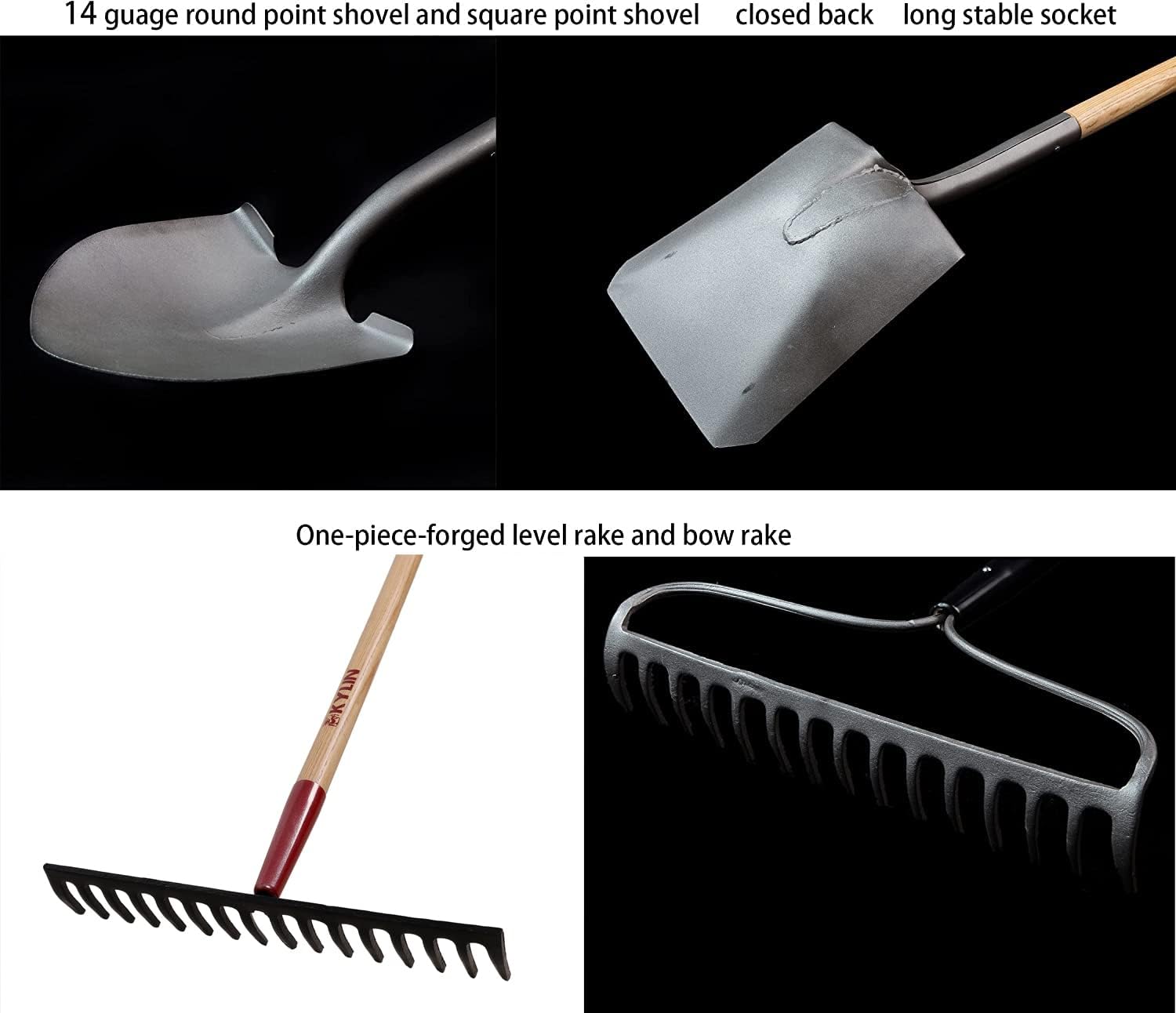 - Round point shovel and Square point shovel - The 14 gauge heavy duty head apply strong force to penetrates rockiest soil easily. They feature a heavy duty, closed back, industrial gauge, steel blade with a backbone ribbon of steel reinforcement along the socket. A longer steel collar strengthens the handle to socket connection. The 49-inch north ash handle with cushion end grip provides ultimate strength and durability to withstand heavy-duty job.