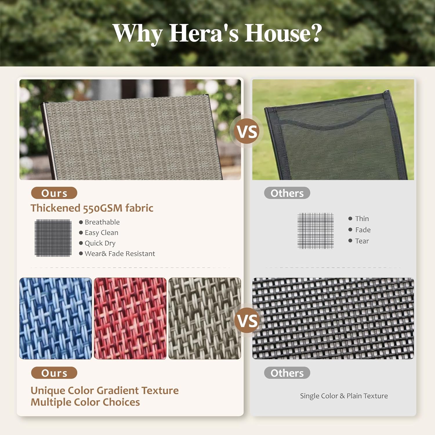 - 【TEXTILENE FABRICS FOR ALL WEATHER】100% high quality thicken textilene fabrics, durable, waterproof, breathable and all weather resistant; easy to clean and care, UV resistant and no fading for long lasting.
