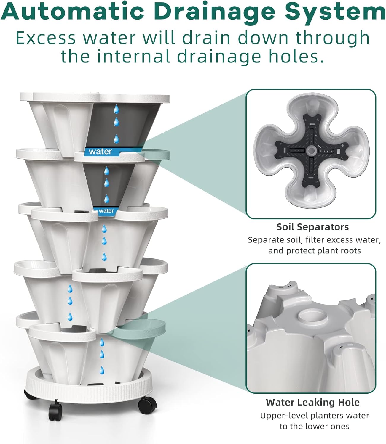 - Flow Design - The water filtration system from top to bottom can save water and retain moisture but prevents overwatering or root rot. 6 filters are placed on each level to keep the soil from going through the big drainage holes, it also helps retain water in each planter level.