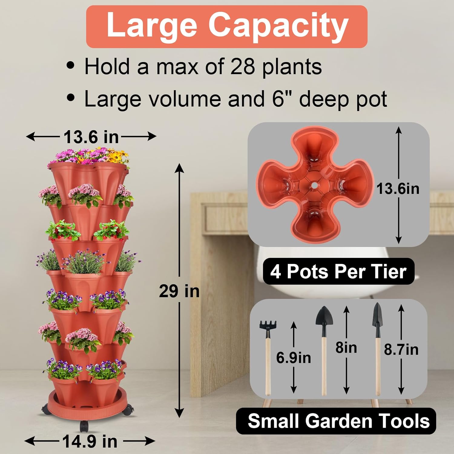 - SOIL HOLDING BOARD - Each tier has a board that holds soil while allowing water to drain down.