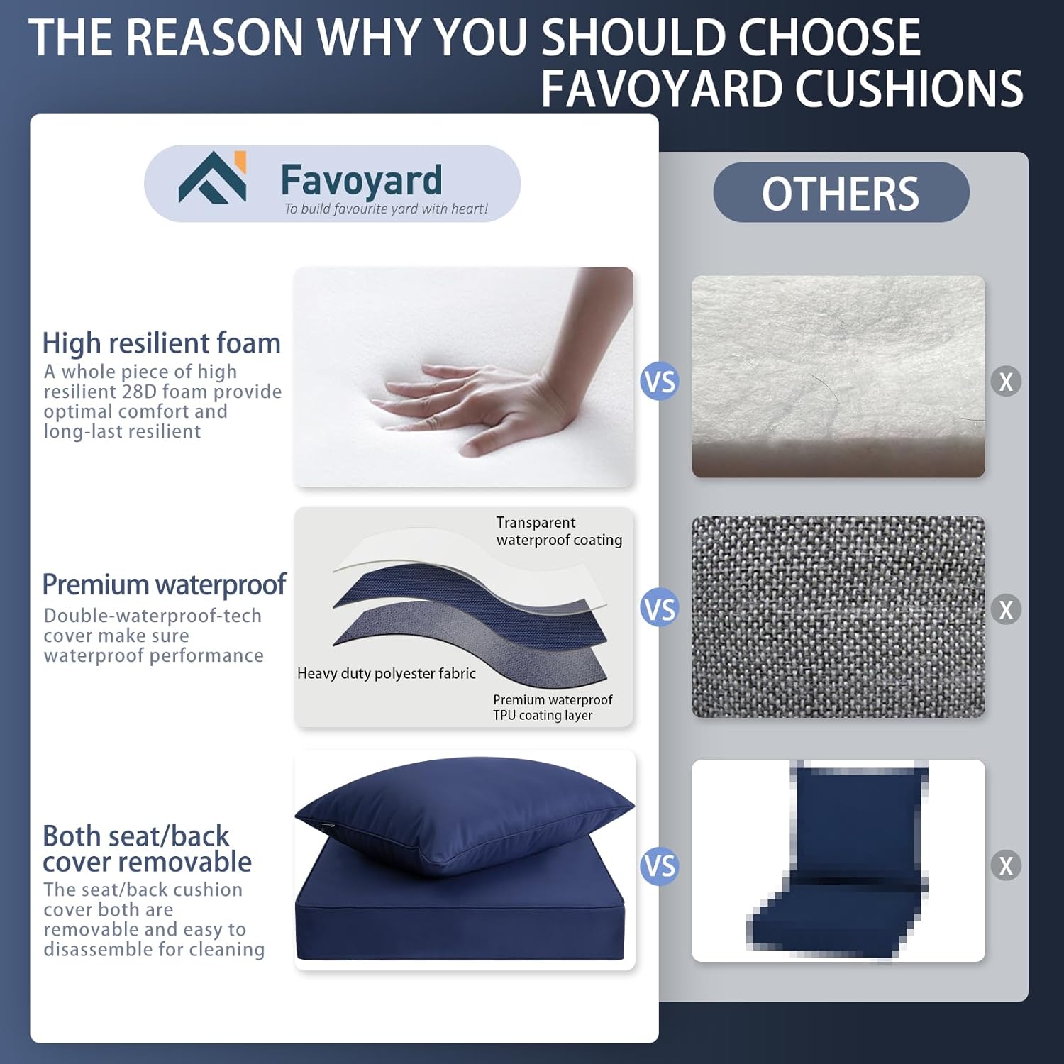 - Double-Waterproof Tech Cushion Cover: Favoyard outdoor cushions for patio furniture choose 300GSM high density polyester fabric for the cover could provide excellent waterproof and dust resistance ability. In addition, there is a TPU coating on the reverse side of the fabric. Both the TPU coating and the fabric are highly waterproof.