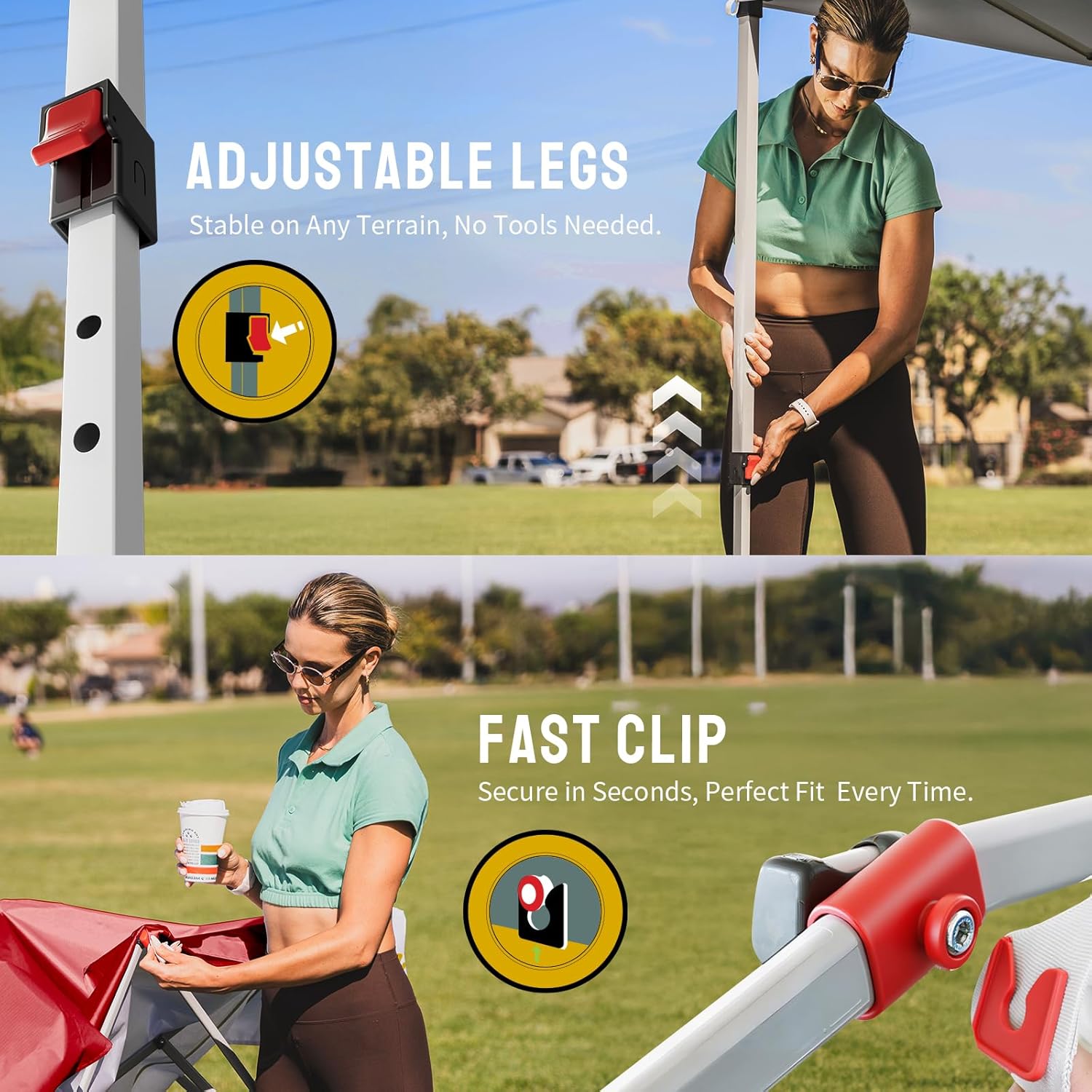 - EZ CLIP CANOPY FABRIC - The new clip system easily attaches the canopy fabric to the frame. The silver-coated interior provides UPF 50+ UV protection, ensuring cooler and safer shade. Made from rugged 150D fabric, the pop up tent is water-resistant and flame-resistant (CPAI-84). The EZ Clip system prevent wind lift and rain pooling, reducing fabric tearing risks. This innovative design is ideal for outdoor events and gatherings
