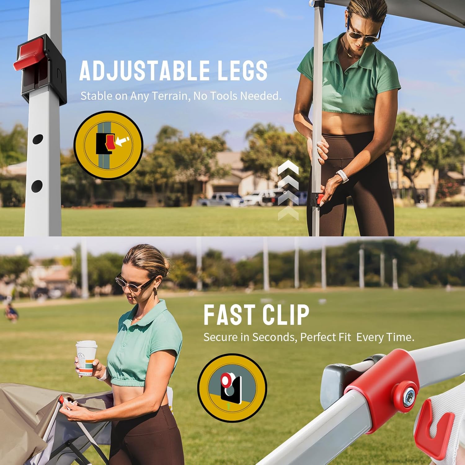 - ONE BUTTON EASY SET UP - Our 8x8 pop up canopy tent features patented one push center lock tech. With just a single push, the central hub locks the poles in place. Designed for the next generation, this outdoor canopy for patio can be set up by two people in seconds without any tools. Three adjustable height settings with soft, pinch-free buttons ensure convenience and safety, making it perfect for camping, beach outings, craft fairs, tailgating, farmer markets, outdoor BBQs, and more