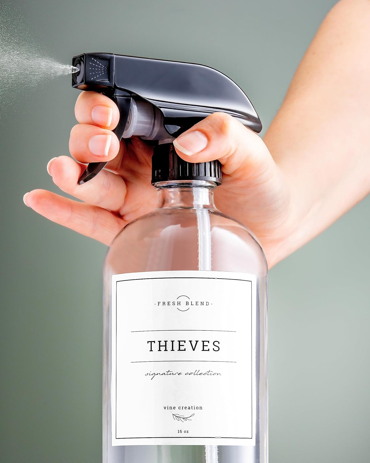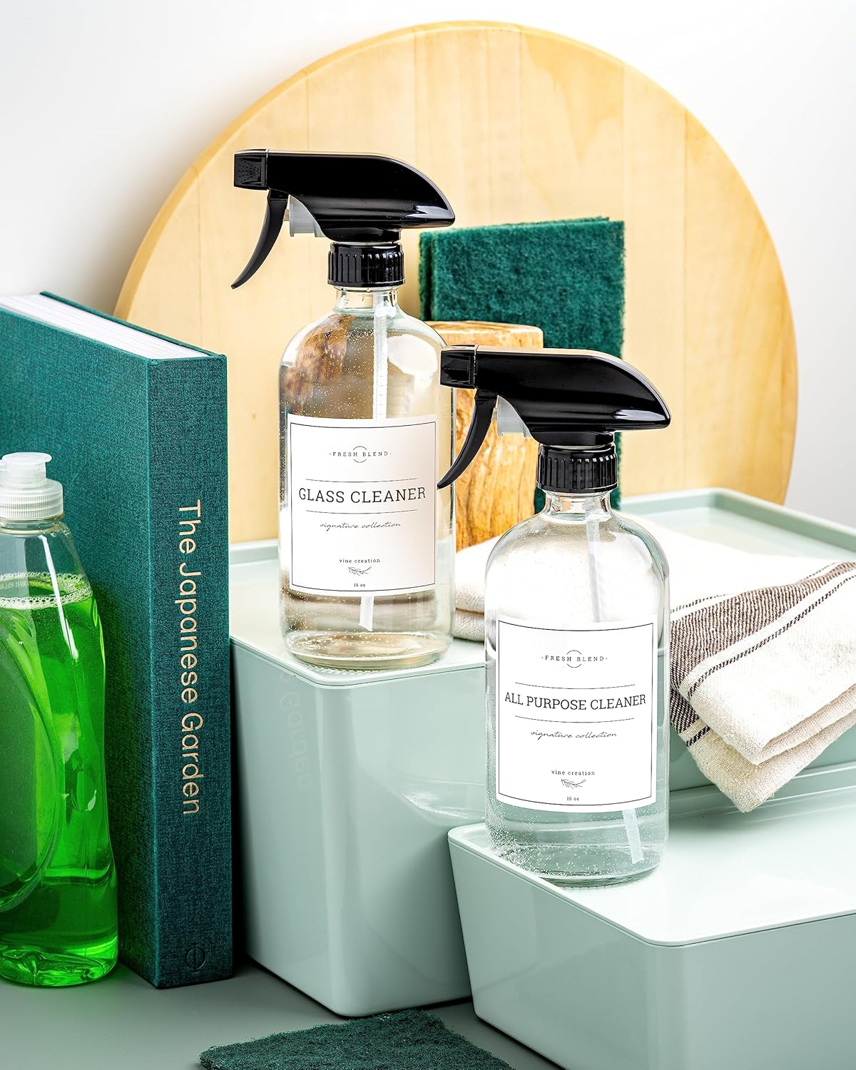 - PREMIUM WATERPROOF LABELS - Ten elegant high-end labels included, glass cleaner, countertop cleaner, vinegar, all purpose cleaner, thieves, bathroom cleaner, degreaser, disinfectant, linen spray, and stain remover. Durable and waterproof for daily use. Additionally two chalk labels for any other needs, white marker is included. Premium Labels measurement 3" x 3".