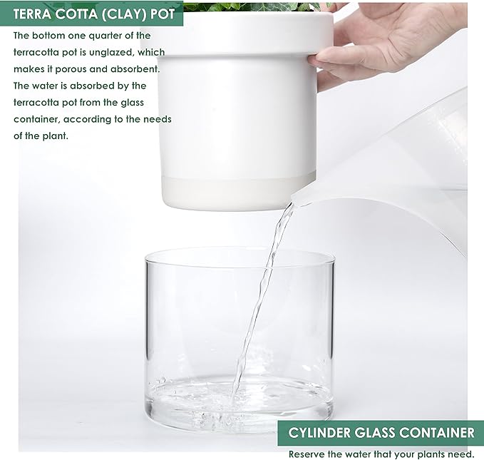 - Self-Watering System: The bottom quarter of the terracotta pot is unglazed, allowing plants to absorb water through the pot walls.