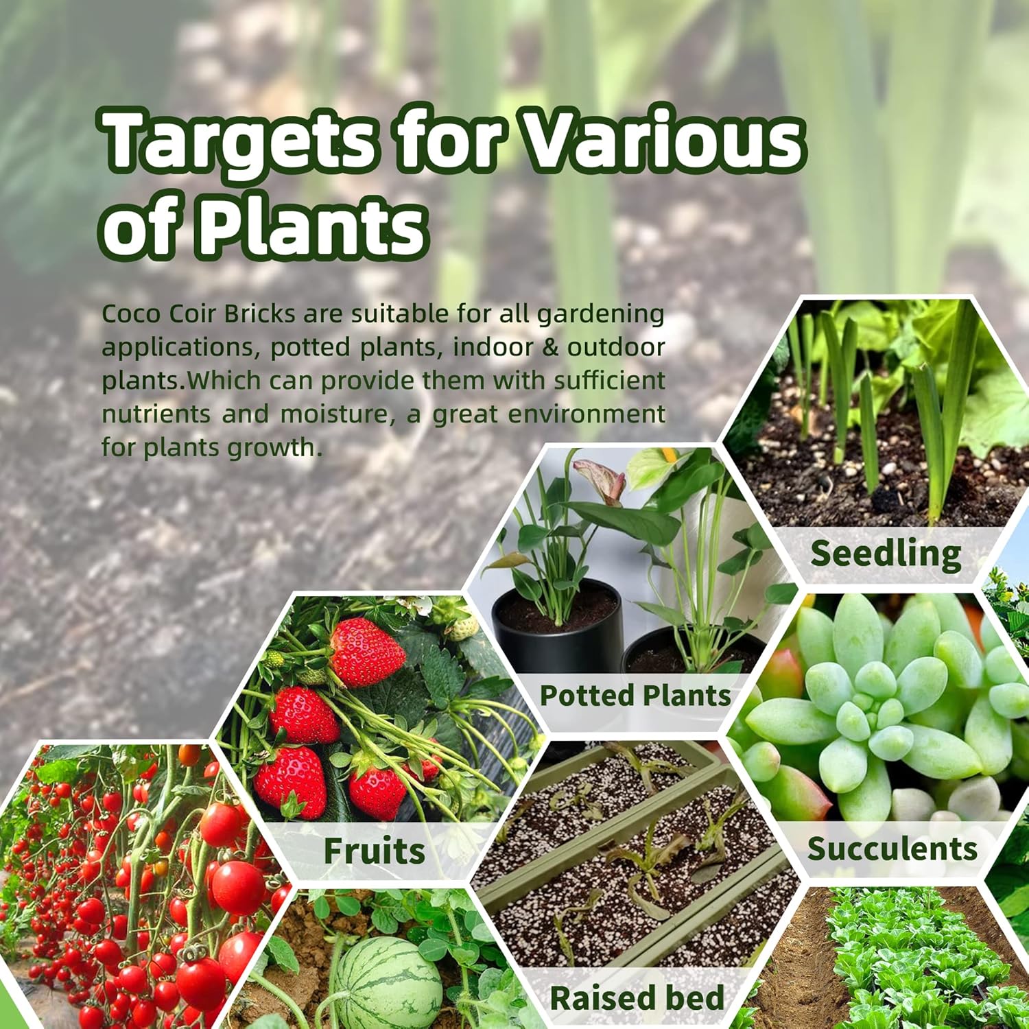 - ✨【VERSATILE】Our coconut brick growing medium offers versatility, catering to a wide range of plant types and applications. Whether it's seed germination, potted plants, micro greens, raised garden beds, or a variety of flowers, vegetables, fruits, and herbs, our coco brick provides ample nutrients and moisture to foster thriving plants. It establishes an ideal growth environment, promoting healthy and robust development.