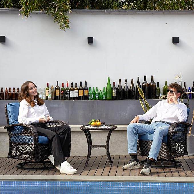 3 Pieces Patio Furniture Set, Outdoor Swivel Glider Rocker, Wicker Patio Bistro Set with Rocking Chair, Thickened Cushions and Table for Porch (Blue)