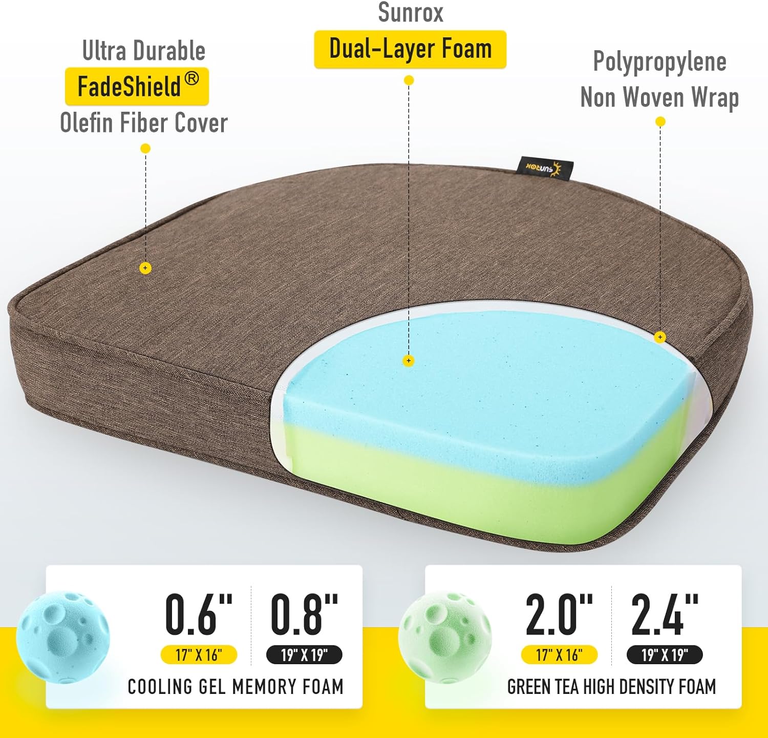 SUNROX Gel Memory Foam Chair Cushions, FadeShield Water-, Stain-Resistant Durable Reversible Seat Cushion Pads with Ties for Indoor/Outdoor Kitchen Dining Office, 19"x19", Set of 2, Heather Chestnut