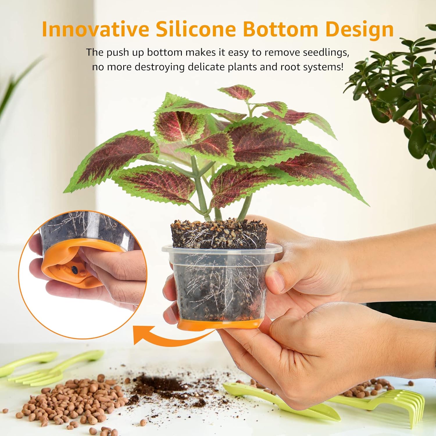- Innovative Design: MIXC's new 4 inch nursery pots feature a flexible silicone bottom that allows for easy transplanting without damaging roots. Simply bend the bottom to push up.