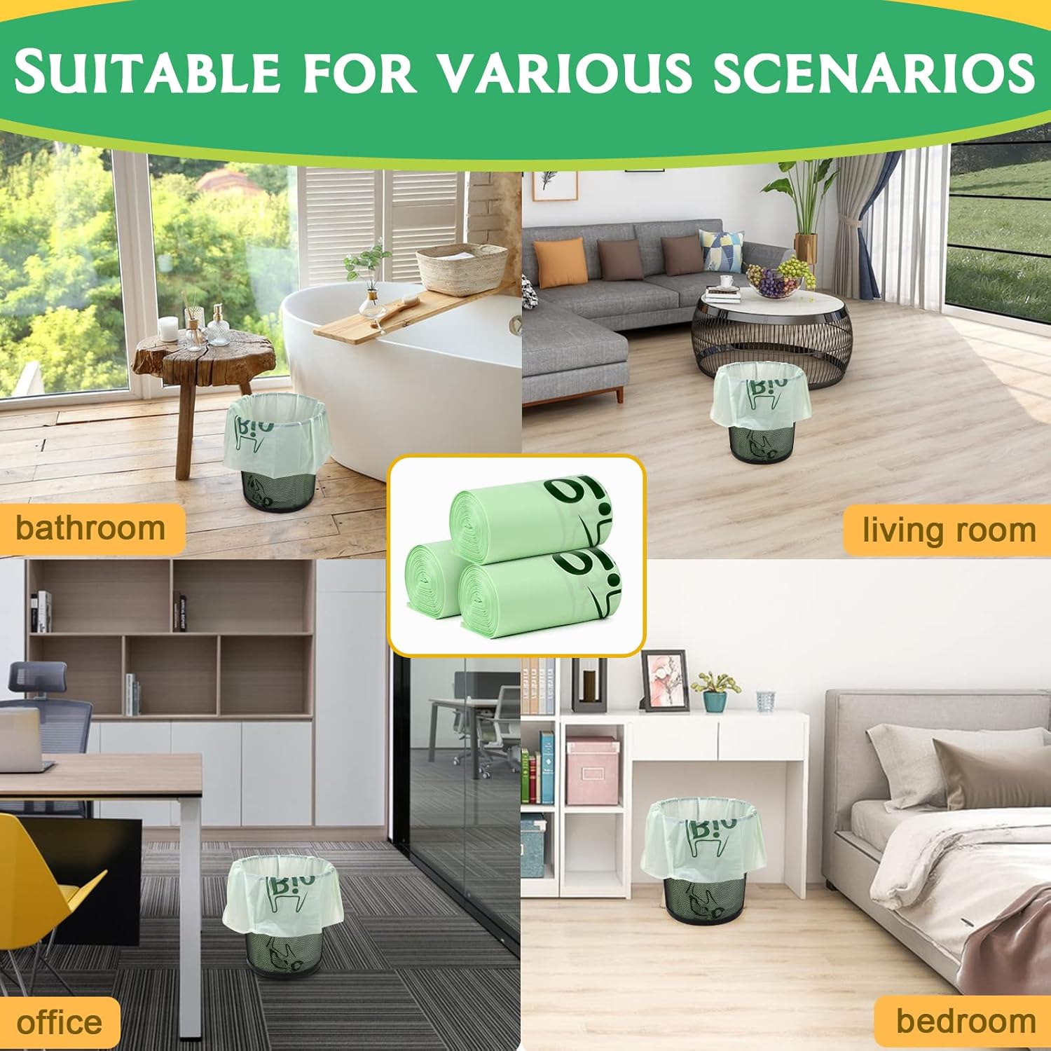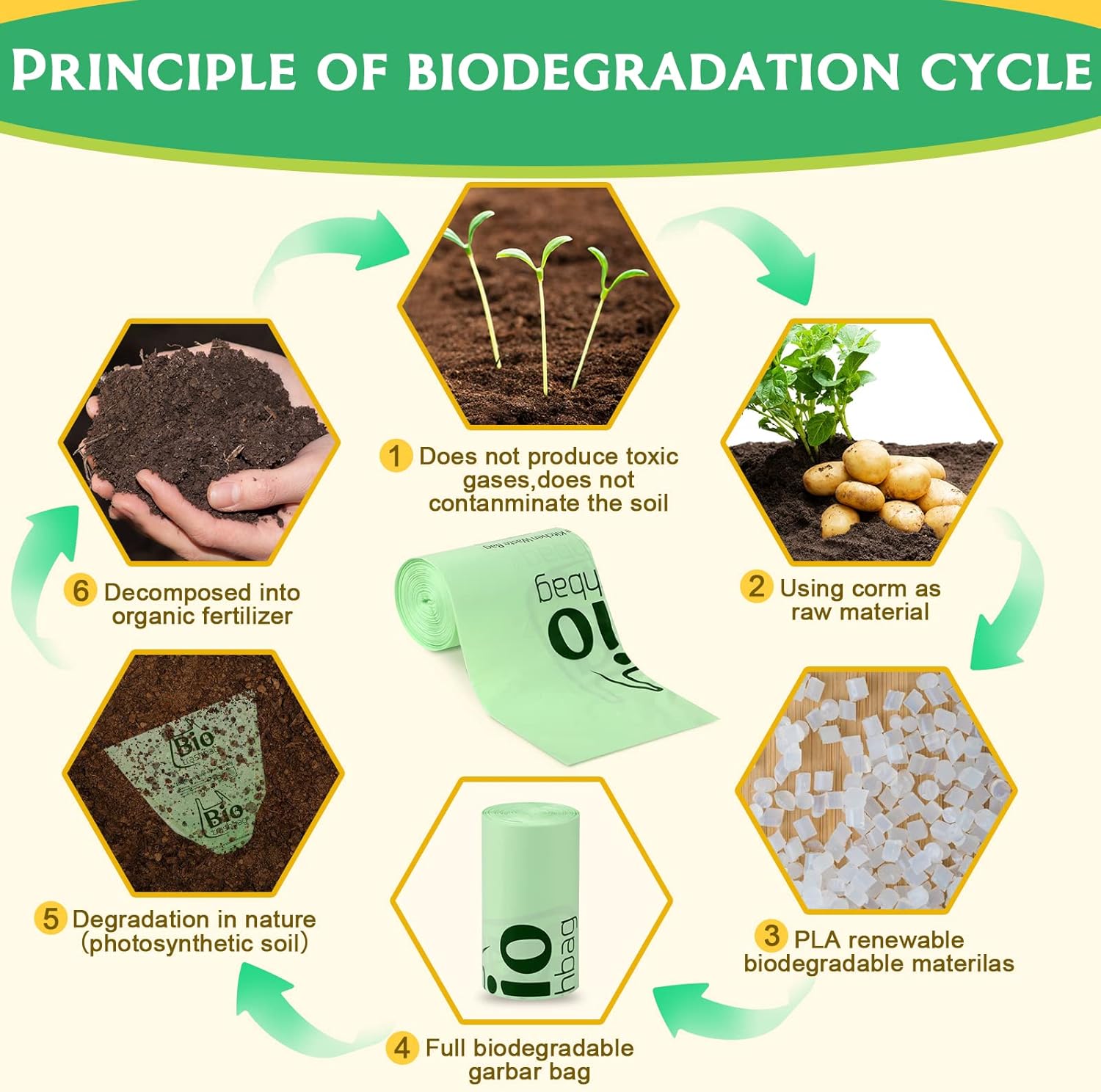 - Biodegradable Garbage Bags: BPI certified compostable bags,kitchen compostable garbage bags meeting US ASTM D6400 & EU EN 13432 standard. Made of cornstarch and renewable plant starch materials, it will decompose in the soil after 6-12 months