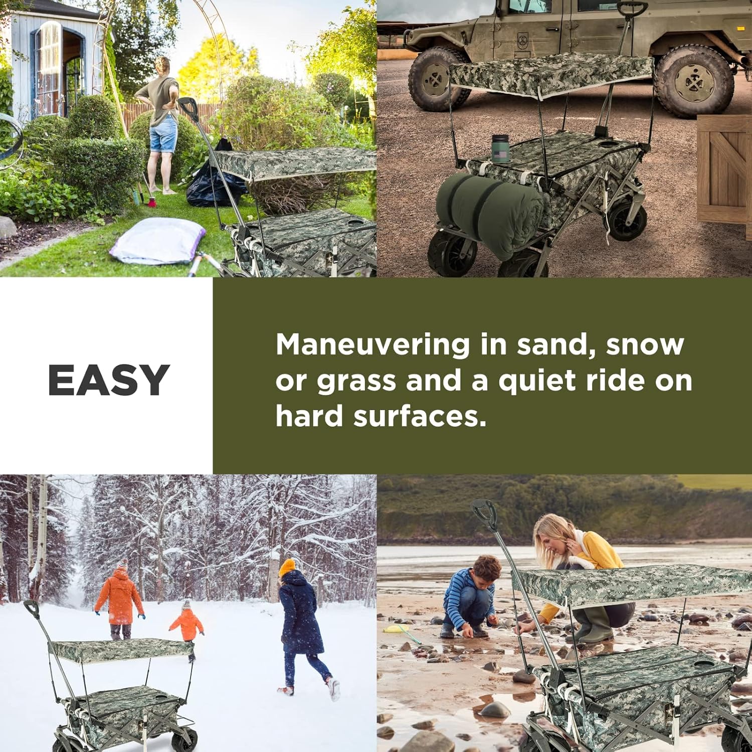 - HUGE RUBBER ALL-TERRAIN WHEELS - Comes equipped with ball bearings for decreased rolling resistance and increased load capacity. You can smoothly glide across many surfaces including grass, dirt, concrete, pavement, sandy beaches, and more! The front wheels swivel 360 degrees to allow a tight turning radius and easily maneuver around obstacles and navigate the terrain. The bigger wheels dampen the bumps in your path so the precious cargo and passengers experience a smooth ride.