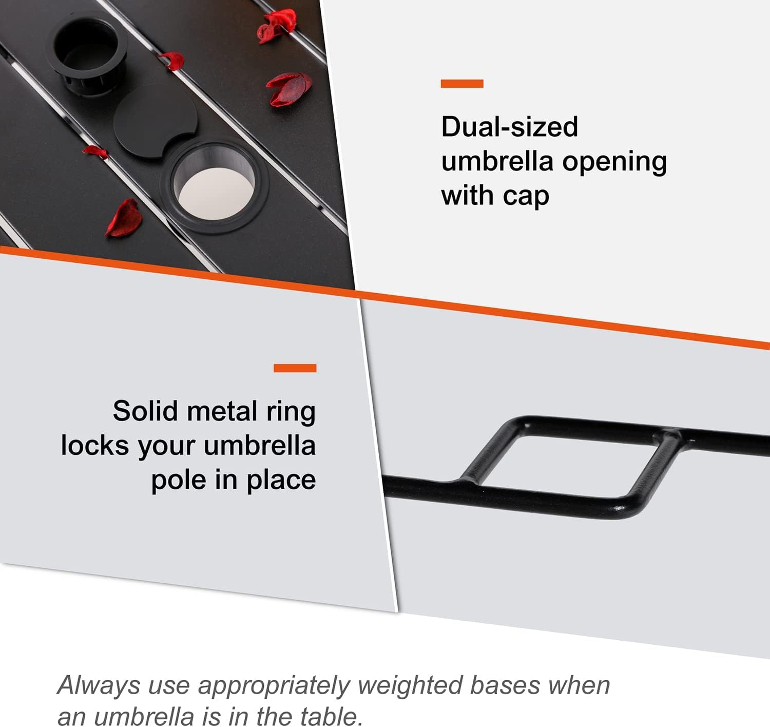 - 【Metal Table Top with Umbrella Hole】This dining table is outfitted with a dual-sized hole for umbrella. Its 1.57"/1.9" diameter hole fits most patio umbrellas for shading outside.