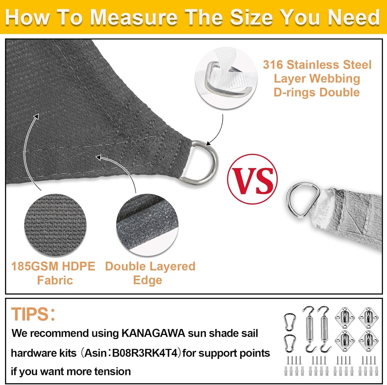 - High Quality Materials: Made of 100% brand new 185 GSM HDPE (high density polyethylene) material.Our sunshade sail is attached with DOUBLE layer webbing in each side and stainless steel D rings in corners to make the sun sail shades stronger and more durable