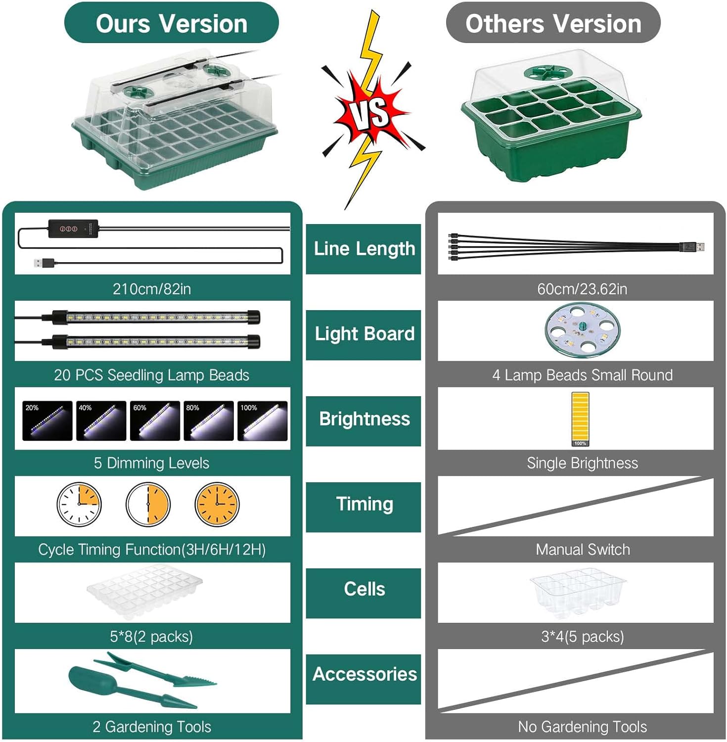 - Base Greenhouse Germination Kit: Seed starting kit with grow light has 5 dimmable levels and 3 timing functions to support different plant growth stages.