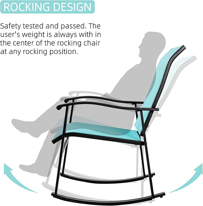 - Elegant Retro Rocking Chairs: Slightly curved lines on arms, the patio furniture sets are more attractive in rocking function designs and adds more comfort to your outdoor patio, deck, backyard porch, or pool.
