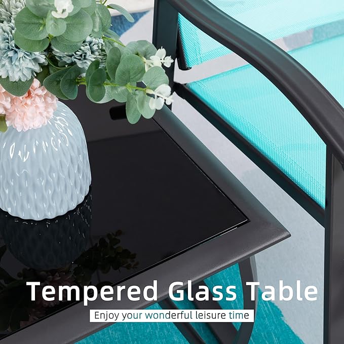- Sturdy and Durable Construction: Made of heavy-duty steel frame with powder-coated treatment to combat water, UV rays, and rust. The table is made of tempered glass, which is vandal-resistant and heat-resistant.