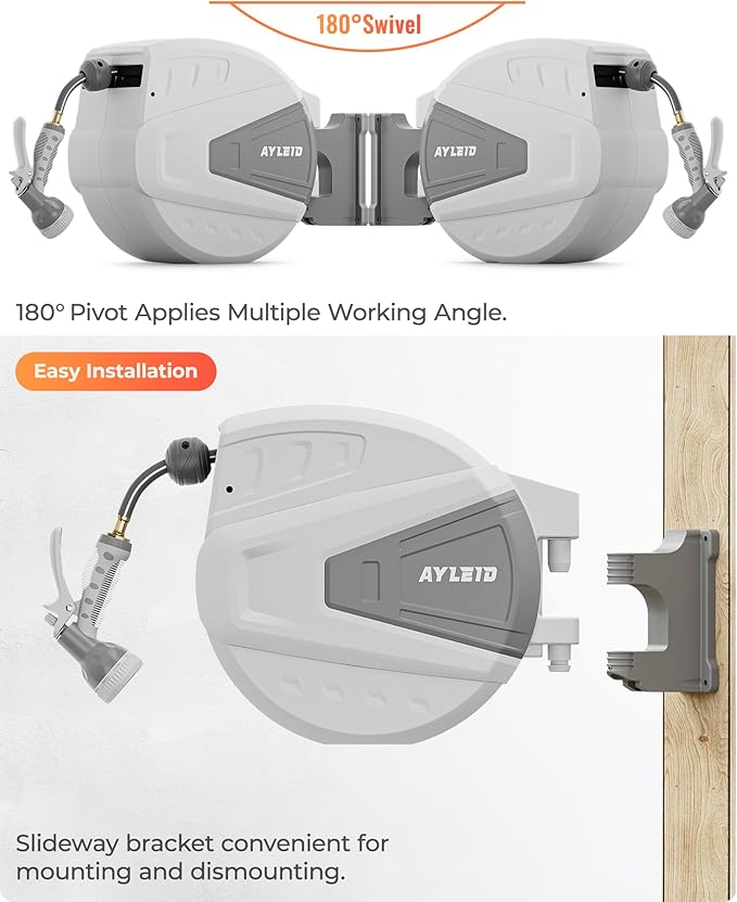 Ayleid Retractable Garden Hose Reel,5/8 in x 100 FT Wall Mounted Hose Reel, with 9- Function Sprayer Nozzle, Any Length Lock/Slow Return System/Wall Mounted/180°Swivel Bracket (Grey)