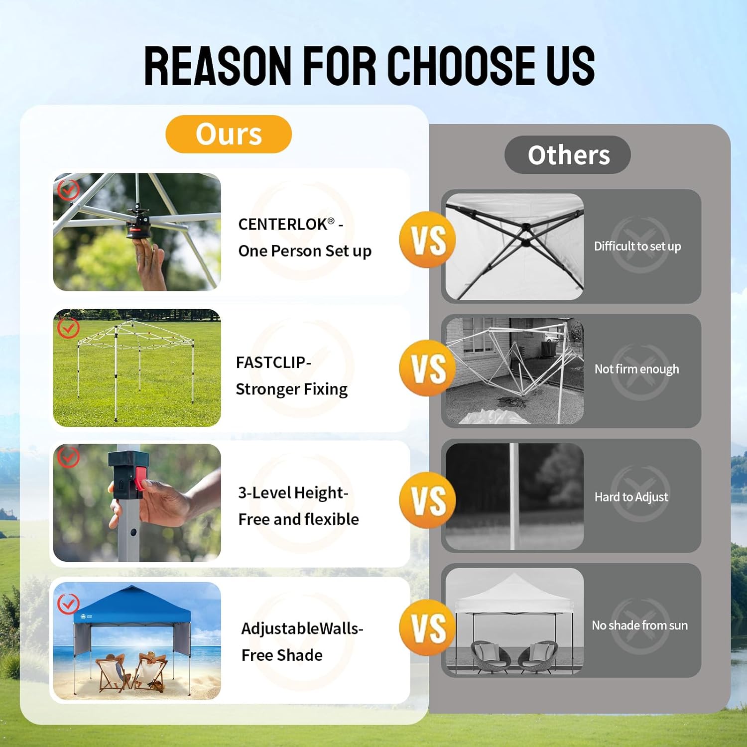 - [EASIEST SET UP]: Patented one push center lock technology – central hub locks out all four legs with a single push. Then use the soft pinch-free buttons to set the leg height. Next generation canopy designed so two people can set it up in seconds with no tools necessary.